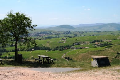 Today you'll follow a trail leading you downhill towards the Ardieres Valley, passing through pretty hamlets, historic chateaux and villages such as Régnié-Durette, with its double spired church built from white limestone. Regnie was the last of the 10 Crus to be recognised as separate labels from the Beaujolais Village and you can try it at your guest house, situated near the village of Beaujeu, the historic capital of the Beaujolais region. 15km, +180m.
