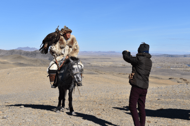 Say farewell to Arman and your host family. Enjoy a scenic transfer to Altantsogts. Welcome to your home for the next few nights. Depending on the dates of your trip, you may be staying with the famous female eagle huntress Aishophan’s family, or with the region’s top Eagle Trainer, Shaimurat. Feel welcome and enjoy a cup of milk tea with the family. Tonight have a traditional dinner, and you may be treated to a dulmur performance, a traditional instrument.