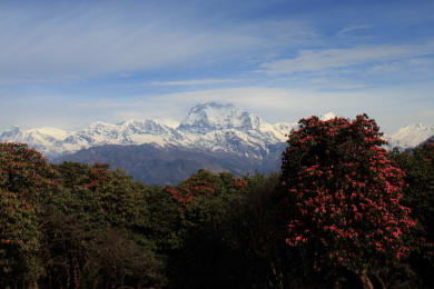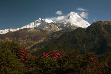We rise early and walk up to Poon Hill to catch the magnificent sunrise over the Himalayas. From Poon Hill, we also get incredible views of Mustang, Pokhara, and more than 20 of the highest mountains. After enjoying a cup of coffee, we trek back to Ghorepani. We have breakfast here then walk towards the east and climb a ridge. Our trail descends through rhododendron forests and waterfalls before we reach Tadapani. Overnight in Tadapani. Meals: Breakfast, Lunch, Dinner