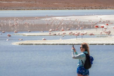 Get off to an early start around 5:00 a.m. to visit the Sol de Mañana Geyser (5,000m) and walk next to fumaroles and steaming craters filled with boiling pots of mud at 150-200 Cº. Then, have the opportunity to take a bath in an open air Hot Springs at a 35 Cº water. The next places to appreciate are the Dali Desert where Salvador Dali found his inspiration from boulders sprinkled in the middle of the desert, and then the Green, and white Lagoon (toxic copper water at the foot of the big Licancabur volcano at 6000m, a few kilometers from the Bolivia-Chile border). Then head back to Uyuni passing by beautiful scenery along the way and eating a picnic lunch along the roadside. Arrive back to Uyuni by 6:30 p.m. and the operator will take you to the bus station where you will embark on the 8:00 p.m. bus from Uyuni town to La Paz City.