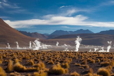 At 5:00am your guide will pick you up from your hotel (time subject to confirmation) and you will head to Tatio Geysers, a geothermal center with geysers that can only be seen very early in the morning. After seeing this spectacular sight in a magnificent natural setting, we eat breakfast. On the way back, we see the majestic Andes Mountain Range, whose peaks seem close enough to touch. We then arrive at Machuca, a small llama herder settlement. The village is filled with adobe houses with thatched roofs. Green wetlands lend a special charm. After this experience is over we will head directly to airport so you can take your flight back home.