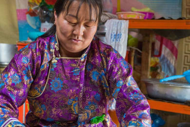 After meeting your guide at 09:00 am in your hotel or another Ulaanbaatar location of your choice board the vehicle for a morning visit to the Gandan Monastery in the western part of the city. Take a guided tour of the temples and see the monks chanting. Then head west to the northern part of Gobi onto Gurvanbulag, where you will be staying at a guest ger alongside a nomadic family. The drive is mostly on paved roads and should take 4 hours (280km). On arrival, enter the family ger and experience nomadic hospitality – sample milk tea, homemade yoghurts and curds, learning about the nomadic way of life and your hosts’ traditions. In the afternoon, if you are up for it, ride a horse to the nearby sand dunes – or you can walk if you prefer. The distance is not long, just 3km each way. In the evening enjoy a traditional nomadic meal of Buuz (steamed dumplings) or khorkhog (mutton seared with hot stones) – you can also help with cooking if you want. Overnight stay at a guest ger next to a nomadic family. Lunch and dinner are included.
