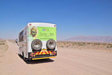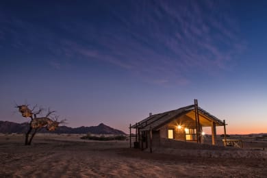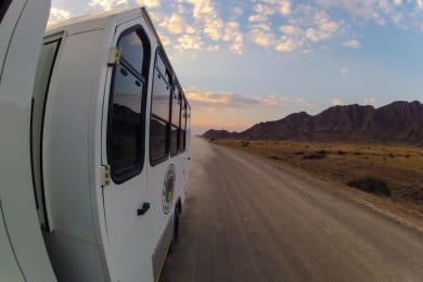 Today we leave Swakopmund at 11h30, so we have the time to join an optional activity. For the adrenaline junkies this could be flying down a sand dune head first at 60 km/h on a sand board, exploring the dune field on a quad biking tour or discover the “old city” of Swakopmund on a fat bike (e-bike option available). Whatever we choose, we depart Swakopmund no later than 11h30 and drive through the Namib Desert via the Kuiseb Pass, crossing the Tropic of Capricorn, stopping briefly in Solitaire arriving at our camp late afternoon. We have a chance to relax and enjoy the views before taking a short walk for sunset looking over the Naukluft mountain range. Overnight is in twin rooms with en-suite bathroom facilities. There is a pool and bar available, and dinner is prepared by our guide. (Distance: approx. 350 km)