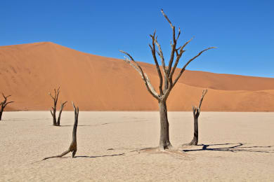 We depart at dawn from camp to arrive at the park gate for sunrise. We drive down an ancient river bed surrounded by towering dunes to the 2x4 parking (around 55kms) and take a 4x4 shuttle into the Sossusvlei area to appreciate the beauty of this place in early morning light and enjoy the peace and tranquility of the region. Furthermore, we explore this unique area on foot before heading into Dead Vlei with its large expanse of bleached cracked clay and skeletal camel thorn trees, contrasting with a backdrop of huge dunes with their ever-changing colours before taking the 4x4 shuttle back to our vehicle. As we drive back to our accommodation we will stop at the famous Dune 45 and climb this dune if we wish or just wander around the base. We return to Sesriem and visit the nearby Sesriem Canyon, one of the few permanent water sources before arriving back at our lodge late afternoon to watch the sunset over this spectacular desert. (Distance: approx.150 km)