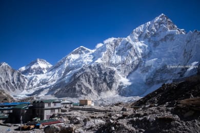 Today we walk to the main destination of the trek - Everest Base Camp. The rocky walk by the Khumbu glacier is quite rough and precarious on some bits, so do be careful. The first village we reach is Gorakshep where we have our lunch and continue to Everest Base Camp. On the way to Base Camp it is important to bring some snacks and water. Explore the Base Camp and return to the guesthouse which is about 5 hours up and down.