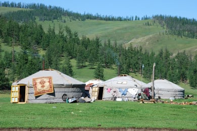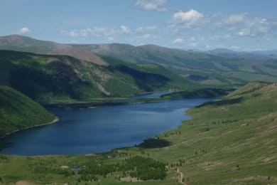 We go deeper in the Khangai mountains. The track is harsh, notably because of a pass located 2800 metres (1,74 mile) above the sea level. We reach the very remote Naiman Nuur National Park, "eight lakes", where we'll see many forests of larches and, as the name suggests, many lakes. This area can be very cool and it's not unusual to have snow in June or in August ! Stay with a nomads family living in this mountainous area, with whom we'll share moments of their daily life.
