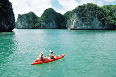 Relax at our secluded island-beach of Ha Long Bay or explore by kayak