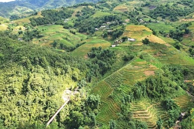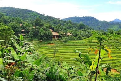 Start early to descend into the beautiful valley, where you walk around tumbling rice terraces. Trek through small paths to slowly reveal a picturesque village sitting at the base of a towering mountain. Your camera will not be able to sit still! Continue to the base of the valley, from where you weave between roads and farmland, villages and wild fields, ponds and rivers, mountains and open land. Savor the ever-changing scenery as you trek to a beautiful spot to enjoy a simple picnic lunch. After enjoying delicious food, you have free time to explore the refreshing water in the nearby river before heading back to your resort. Overnight in Pu Luong.