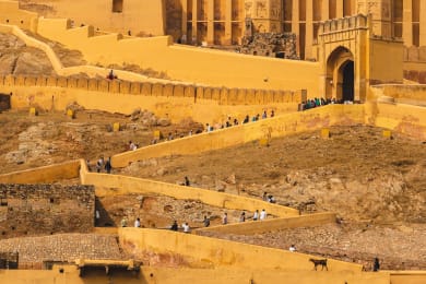 Breakfast at the hotel. Jaipur, also known as the "Pink City" and the gateway to the princely state of Rajasthan. Forts of Rajasthan, visit Amber Fort by Jeep. This fortress on the top of the hill was the residence of the royal family and is one of the most charming forts in India. A complex of palaces, temples, inlaid mirrors in public rooms and beautifully manicured gardens, the fortress is an exquisite example of Rajput architecture. Inside the fort there are charming palaces and notable chambers including the Sheesh Mahal (Palace of Mirrors) and Diwan-e-Aam (Public Hearing Room). Afternoon: visit to the pink city of Jaipur, Jantar mantar observatory, city palace and pass the magnificent façade of Hawa Mahal. Overnight at the hotel.