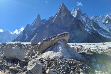 Down onto the glacier, our path follows the center of the ice river, sometimes walking on moraine and sometimes on snow and ice. We get our first views of the K-7 and the stunning spire of Nayser Brakk.