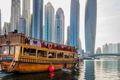 Your Guided City tour of Dubai will start with a drive through the residential areas of Jumeriah, one of the luxurious parts of Dubai, and home to the beautiful Jumeirah Mosque. From here, your journey to explore the city's history begins as your next stop will be Al Bastakiya Area; you can still find some parts of the town that existed over 40 years ago. Learn about the culture and history of the city from your tour guide. Get aboard the Abra (the traditional water taxi) and ride across Dubai creek to reach Dubai Gold and Spices Souk. It is the place to buy good quality spices, and we will guide you to the famous Gold Souk of Dubai. Your Half-Day Trip will end, and we will drop you off at your Dubai Hotel. Lunch (on your own). Free afternoon for leisure Meet our driver around 07-7.30 pm for a fun-filled fine dining experience in Dubai Marina. The beautiful Alexandra wooden Dhow Cruise awaits you with a luxury dining experience. Get aboard our luxury boat equipped with all the fine amenities, the boat has a glass-covered lower deck and an open upper deck with seating like in a restaurant. While you enjoy the stunning view of Dubai Marina, our team will set up the buffet, the mouth-watering 5-star international buffet dinner will be the main highlight of our Dhow cruise dinner. After your delicious dinner with onboard entertainment and your sightseeing cruise in Dubai Marina, you will be transferred back to your hotel in Dubai.