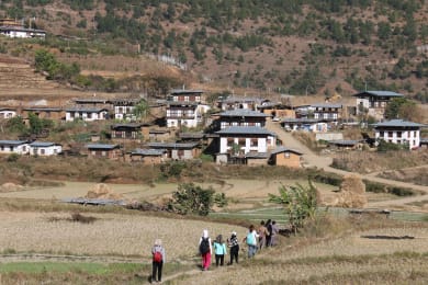 After breakfast, hike to the picturesque Khamsum Yuellay Namgyel Chorten on a peaceful hilltop and after lunch transfer to Phobjikha valley and then venture out on Gangtey Nature Hike through the pristine valley. Khamsum Yuellay Namgyel Chorten is located on a serene hilltop overlooking the fertile Punakha valley with glacial-fed Mochu river meandering through the valley. The hike leads through the terraced rice fields and takes about 2.5-hours round trip for most visitors. Retrace your footstep back to the road head and drive back to the town for lunch. After lunch, transfer to Phobjikha valley, a vast U-shaped glacial valley at an elevation of about 3,000m/9,840ft and a winter home for endangered Black Necked Crane from November to March and migrates back to Tibetan Plateau by the beginning of spring season. As part of the conservation effort, Phobjikha valley has been declared as a protected area. Distance from Punakha - Phobjikha 80km, Driving time 3-hours, Phobjikha valley altitude 3,000m Upon arrival in Phobjikha valley, check into the hotel and settle for hot tea and snacks. Then you will go on an exciting Gangtey Nature Hike. The trail is about 5km and takes approximately 3 hours through the woods surrounded by splendid nature all around, wonderful meadows, beautiful traditional village houses, farmlands and crystalline streams. This short nature trail gives you a great feeling of the valley and an understanding of the livelihood of the people living there. Lots of opportunities to take beautiful pictures! Note: If there is not enough time, you can do the hike tomorrow morning. Overnight at Dewachen Hotel & Spa or Yue-Loki Guest House