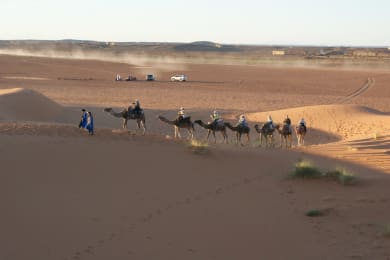 Today we start our tour from Fes and we start travelling south to Merzouga via Midelt and Errachidia. Your first stop will be at Ifrane city, referred to as “the Switzerland of Morocco”, and then to Merzouga via Midlet and the Ziz Valley. During this journey you’ll experience glimpses of the Middle Atlas and Higher Atlas mountains. Stopping at the famous cedar forest – the largest one in Morocco – where you will have the opportunity to see the Barbarian apes. You’ll notice how the scenery changes to reveal hints of the desert as you approach the Er Rachidia city. After lunch in Midelt, your journey continues along the spectacular Ziz Valley, stopping for panoramic views along the way. We will drive through Berber villages to Erfoud, then to Rissani ; the foundation of the Alaouite dynasty – the current ruling royal family in Morocco. Arriving in Merzouga at the end of the day, you’ll be welcomed with a glass of mint tea and ride your camel to see the sunset in the middle of the highest sand dunes in morocco and spend the night there. Overnight at our desert camp where you will have your dinner.