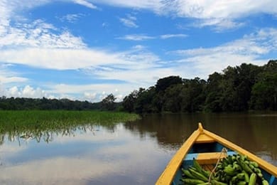 Transfer to the airport. Flight Bogotá – Leticia. Upon arrival at Leticia airport, you will be welcomed by your local guide and you will take a small boat to go to Calanoa nature reserve through the majestic Amazon river. At the lodge, you will enjoy a wonderful garden with palm trees, heliconia butterflies, and fruit trees. At the end of the day, your guide will take you on a walk in the jungle under the light of the moon. This activity will introduce you to the Amazon by learning more about the fauna and flora of this luxuriant area. Note: fee at Leticia Airport (around 30 000 COP/pers) to pay with the local currency. Note: the last public boat leaves Leticia at 2 p.m. Taking a private boat from Leticia is possible. Optional: english-speaking guide for the day.