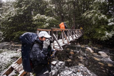 5 hours, 9 km Night at Los Perros Campsite (B-BL-D) Today is a day to please the senses, filled with beautiful sights and textures. Often touted as one of the most beautiful sections of this wilder side of Torres del Paine, we’ll hike through ancient beech forests, wander undulating trails and follow Los Perros River. Mountains, waterfalls and lush vegetation will never be far away, as our trail crosses the river via suspension bridge and arrives at the base of our second terminal moraine; this time belonging to Glacier Los Perros, a hanging glacier that feeds the crystalline lagoon at its base. A final half hour hike takes us to today’s destination, Los Perros Campsite. Tonight’s campsite is the only one on the Circuit without hot showers and standard bathroom facilities such as flushing toilets.