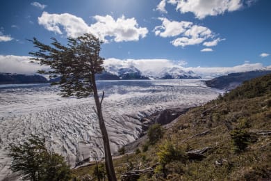 10-11 hours, 22 km Night at Grey Campsite (B-BL-D) The most strenuous day of the Paine Circuit has arrived, bringing demanding trails and variable weather conditions. Of course, your efforts will be more than rewarded with some of Torres del Paine’s most heart-stirring landscapes, experienced by very few visitors to Torres del Paine. We’ll begin along a clear trail through forests, then make our way through swamp-like section before beginning our ascent to the John Gardner Pass. At this Pass, 1200 meters above sea level, Patagonia’s famous winds are strong and the views across Grey Glacier and of the Southern Patagonian Ice Field’s still unexplored peaks are astonishing. The trail now takes you alongside the glacier, ascending and descending through forests of fallen trees and beneath the imposing, almost muscular granite walls of Cordon Olguín. As we come closer to Grey Glacier we may see an ice calving (where chunks of ice break off a glacier’s edge). Tonight we’ll recharge at Grey Campsite.