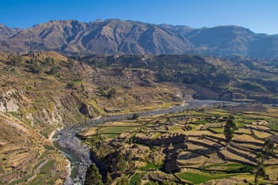 After breakfast, you set off to the spectacular Colca Valley to travel up the foothills of Chachani Volcano and admire the Misti and Picchu Picchu Volcanoes. Subsequently, you cross the vicuña reserve of Pampa Cañahuas, where you can see the smaller version of the llama roaming freely in the Andean highlands. The next stop is at a restaurant called the Chinitos, located at an altitude of 4000 meters. Here, passengers can use the restrooms and drink the traditional ‘Mate de Coca’, helping you to get used to the altitude. Continuing the trip, you make a stop at Toccra Pampa, where you can see llamas, alpacas, and different species of birds near the crater of the Chucura Volcano, to subsequently reach the scenic viewpoint Los Andes in Patapampa (4910 meters). From here, you have a breathtaking view of various volcanoes surrounding Arequipa. You have lunch (not included) in the legendary town of Chivay, after which you go to your hotel. Entrance to Colca Valley is included.