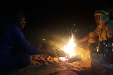 Departure from Tin-Merzouga towards In-Jaran; visit to the cave paintings of Abu-Hadiene; lunch on the dunes of In-Zaouatene then departure to reach the bivouac in In-Jaran