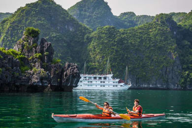 07h30: Have breakfast, coffee, and tea is served. 08h30: Have a slight breakfast while cruising to discover more about Bai Tu Long Bay and go into Vung Ha. 09h00: Drop anchor at Vung Ha and discover Vung Ha geological park through kayak to see a panorama view of Bai Tu Long Bay with thousands of islets around and is where you can stay on a private beach to relax, take sunbathing, and go swimming at Vung Ha Beach. 12h30: Have lunch on a boat in a romantic area of Bai Tu Long Bay. 13h30: You will come to discovering Be Ong Dau area by kayaking. You will discover a huge lake surrounded by mountains. Take sunbathing and swimming at Be Ong Dau Beach. 15h00: Kayak back to the boat start cruising back to Cong Do for stay overnight. 19h00: Vietnamese style set dinner is served. 21h00: Take some leisure time to enjoy chatting at the bar or enjoy some night fishing. Relax and spend a romantic night on Cruises.