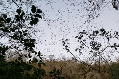 - Breakfast at Coral Bar & Grill - Drive from Xcalak to Calakmul - Make a stop in the Biosphere to see the Sunset & the Bat Cave: You wait with anticipation high above the entrance of the cave. As twilights begin single bats begin to emerge and the birds of prey begin screeching and circling above. Finally, the flood gates open and millions of bats swirl out of the cave, spiraling toward the sky. You feel them fly by you and while your instincts say “duck” you know that the bats won’t hit you. - Check-in Hotel Puerta Calakmul